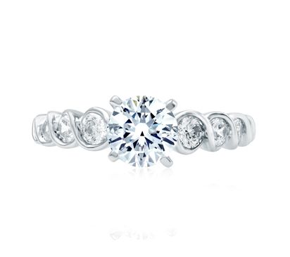 Graduating diamonds surrounded by wave like semi bezels flow down the shank of this engagement ring which also features the A.JAFFE signature shank.